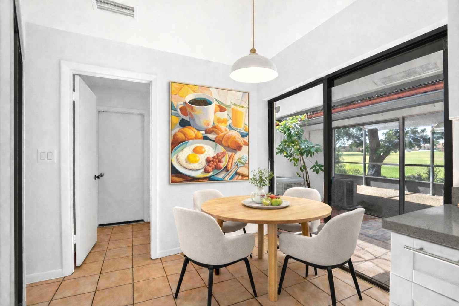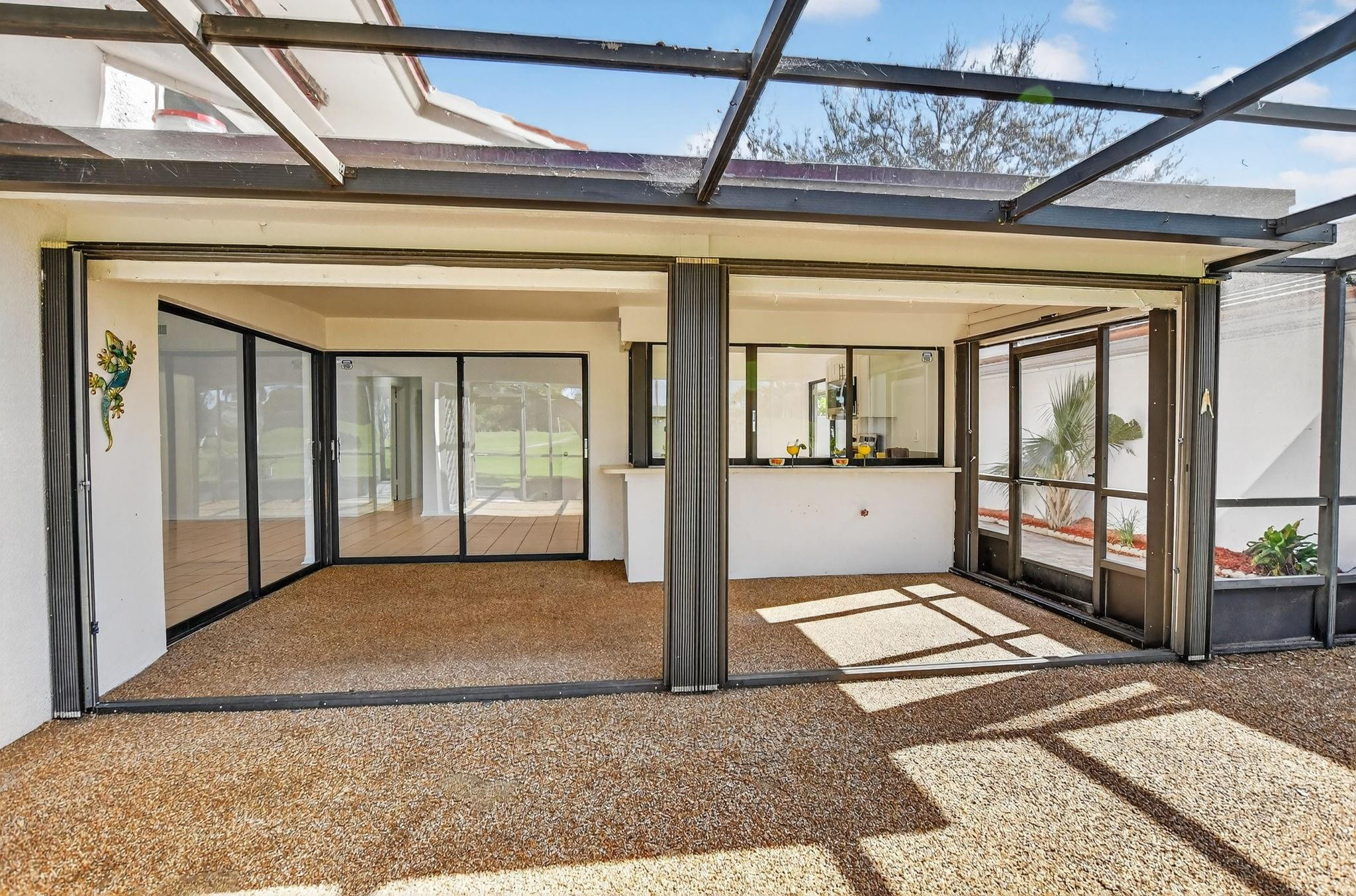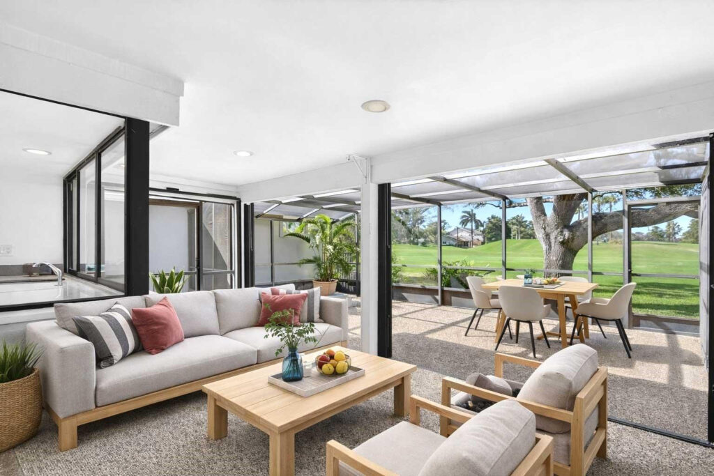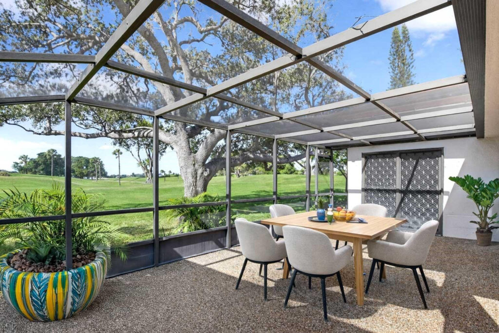 Deer Creek fairway home in sought-after THE HOLLOWS! This 3BR/2BA residence features a wide-open floor plan w/ soaring 14’ ceilings & abundant natural light. Oversized great room flows into formal DR and covered patio—perfect for entertaining. Chef’s kitchen offers newer S/S appliances, quartz counters, white shaker cabinets, large pantry, and pass-through to patio. Spacious corner primary suite boasts luxury vinyl plank flooring, a large walk-in closet, & bath w/ tiled shower & sweeping FAIRWAY VIEWS. Split-bedroom layout provides guest privacy. Enjoy endless sunsets from the screened and covered lanai overlooking the 4th fairway! Inside laundry, 2016 A/C, new electric panel, hurricane-rated garage door. No equity membership required. Low HOA includes lawn care. Minutes to sandy beaches.